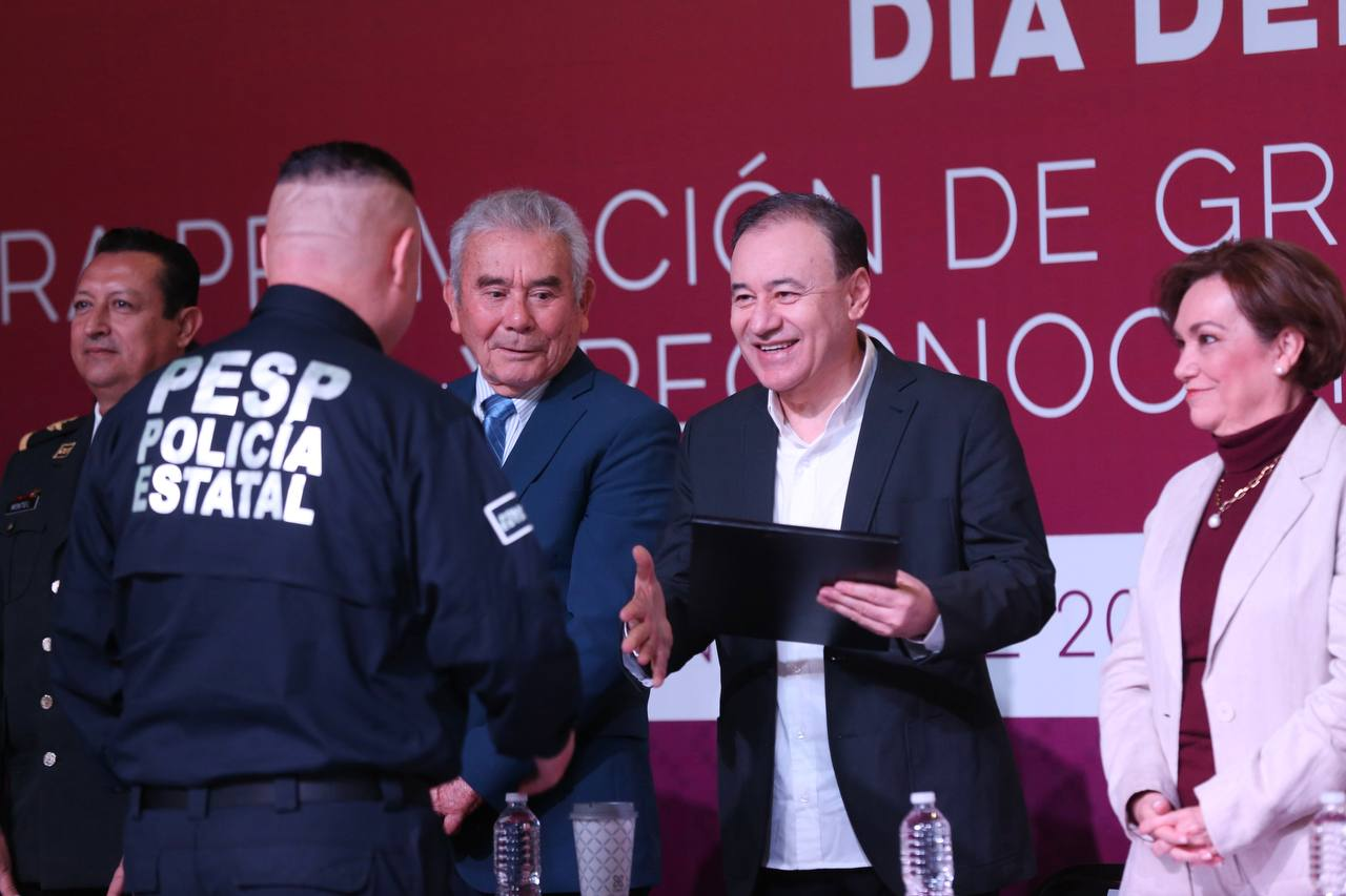 Hermosillo, Sonora; 16 de enero de 2023.- El gobernador del estado, Alfonso Durazo Montaño, conmemoró el Día del Policía con la entrega de ascensos a integrantes de la Policía Estatal de Seguridad Pública (PESP) que participaron en la primera convocatoria del Servicio Profesional de Carrera, iniciativa que busca dignificar la labor del personal la corporación.