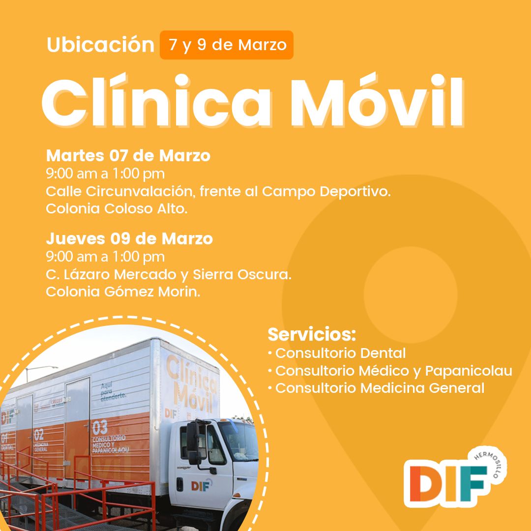 Hermosillo, Sonora; 6 de marzo, 2023.- Todos los servicios gratuitos de la Clínica Móvil de Salud de DIF Hermosillo se trasladarán esta semana a las colonias Coloso Alto y Gómez Morín.